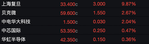 截至收盘,上海复旦上涨近10%,中芯国际、华虹半导体也均上涨。