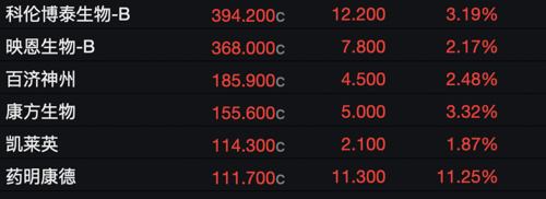 创新药概念股大涨,截至收盘,药明康德涨超11%。科伦博泰生物-B、映恩生物、百济神州、康方生物、凯莱英等均上涨。