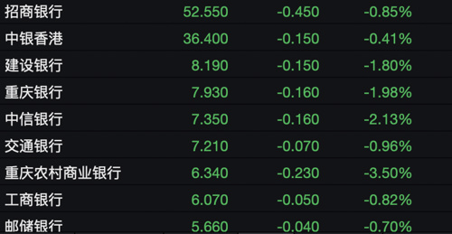 截至收盘,重庆农村商业银行跌幅超3%,招商银行、建设银行、中信银行等均下跌。