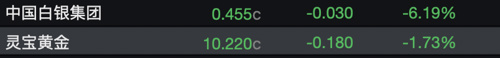 此外,黄金股继续回调。中国白银集团跌超6%。