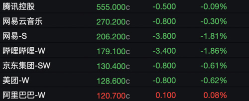截至收盘,网易-S、哔哩哔哩-W跌超1%。