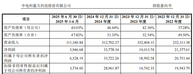 2022年至2024年及2025年上半年,电科蓝天的营业收入分别为25.21亿元、35.24亿元、31.27亿元及11.13亿元,归母净利润分别为2.08亿元、1.90亿元、3.37亿元及6528.19万元。