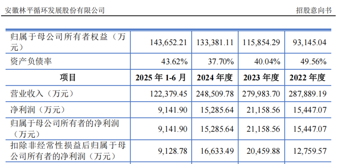2022年至2024年及2025年上半年,林平发展的营业收入分别为28.79亿元、28.00亿元、24.85亿元及12.24亿元,归母净利润分别为1.54亿元、2.12亿元、1.53亿元及9141.90万元。