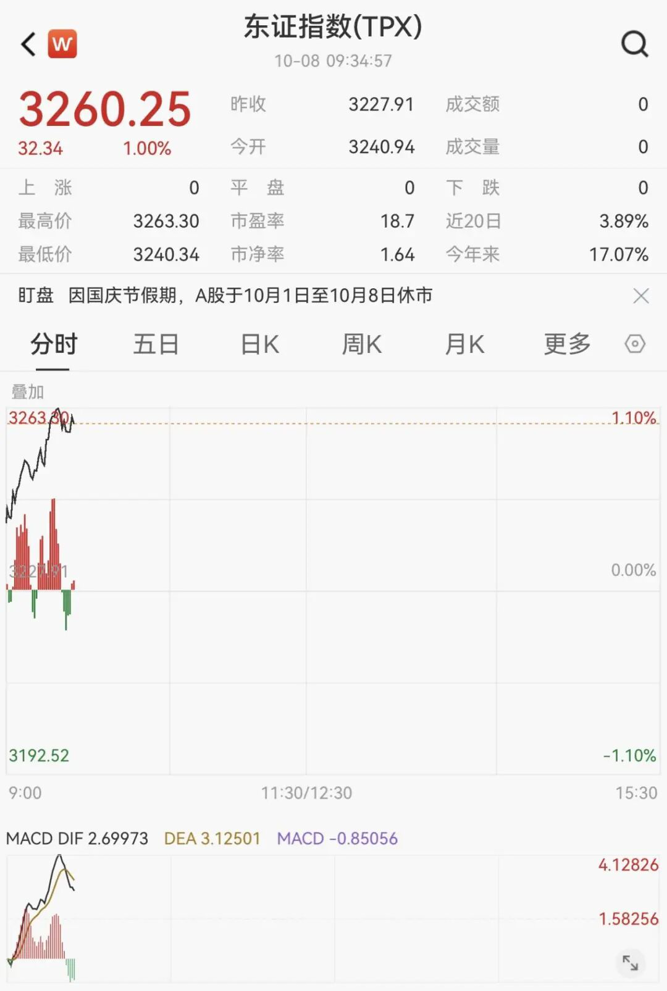 10月8日,日本股市震荡拉升,日本东证指数涨1%至3260.25点。