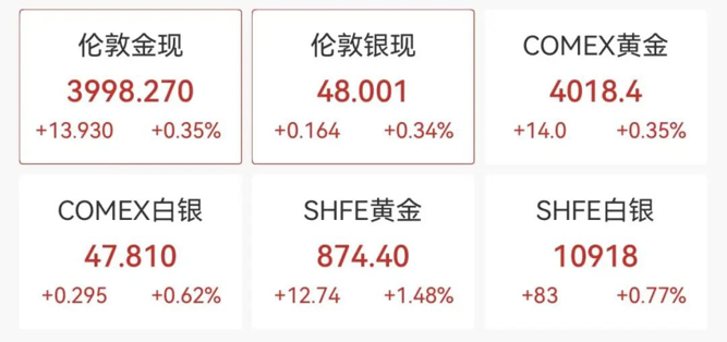 10月8日早盘,黄金期现货集体走高,现货黄金一度突破3999美元/盎司,续创历史新高,逼近4000美元/盎司;COMEX黄金期货持续走高,现报4018.4美元/盎司。