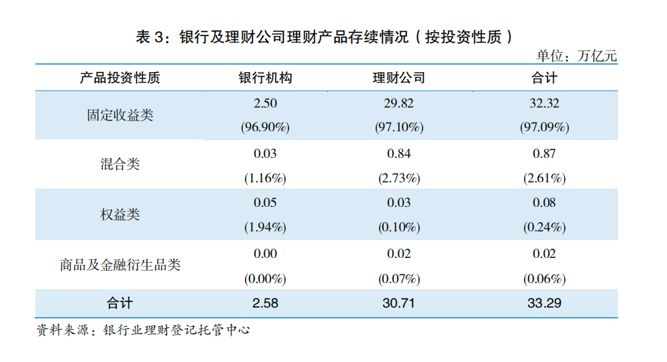 分类型来看,截至2025年末,固定收益类产品存续规模为32.32万亿元,占全部理财产品存续规模的比例达97.09%,较年初减少0.24个百分点;混合类产品存续规模为0.87万亿元,占比为2.61%,较年初增加0.17个百分点。