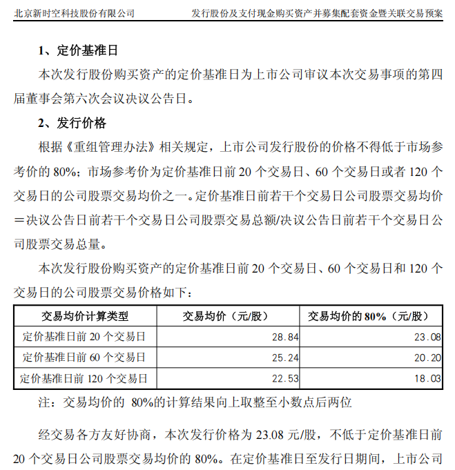 交易预案显示,时空科技此次发行股份的价格为23.08元/股,不低于定价基准日前20个交易日公司股票交易均价的80%。
