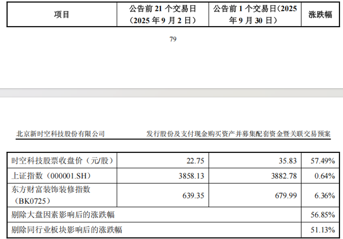 在此次重大资产重组信息公布前的20个交易日期间,时空科技的股价累计上涨57.49%,剔除上证综合指数上涨0.64%的影响后,涨幅为56.85%;剔除东方财富装饰装修指数上涨6.36%的影响后,涨幅为51.13%。