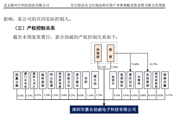 交易预案显示,时空科技拟通过发行股份及支付现金的方式收购嘉合劲威100%的股份,交易对方共19名,包含张丽丽、陈晖、深圳东珵管理咨询合伙企业(有限合伙)、深圳普沃创达管理咨询合伙企业(有限合伙)等。