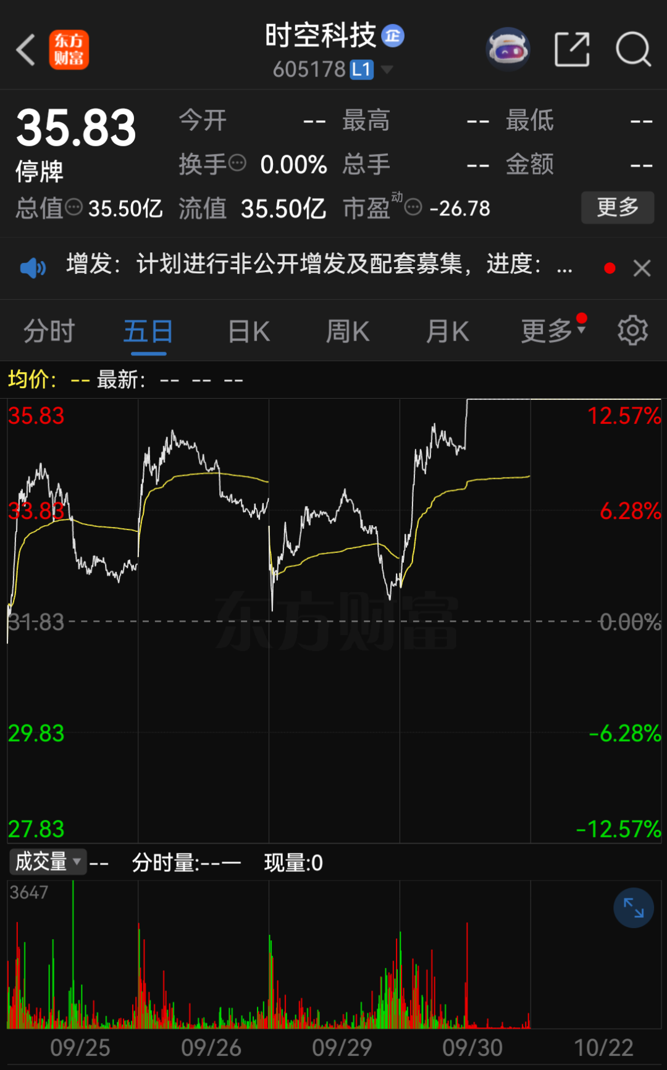 时空科技自10月9日开市起停牌,计划自10月23日开市起复牌。截至9月30日收盘,公司股价报35.83元/股,总市值为35.50亿元。