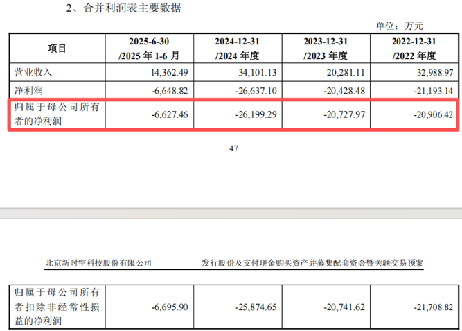 2022年至2024年及2025年上半年,时空科技的业绩均处于亏损状态,其中归母净利润分别为-2.09亿元、-2.07亿元、-2.62亿元及-6627.46万元。