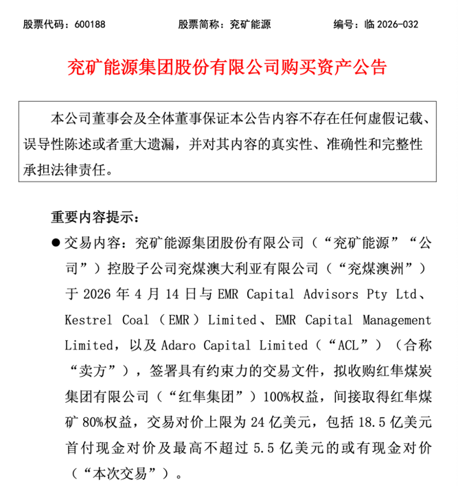 4月14日晚间,国内煤炭龙头企业兖矿能源发布公告称,公司控股子公司兖煤澳洲与卖方签署具有约束力的交易文件,拟收购红隼集团100%权益,从而间接持有红隼煤矿80%权益。