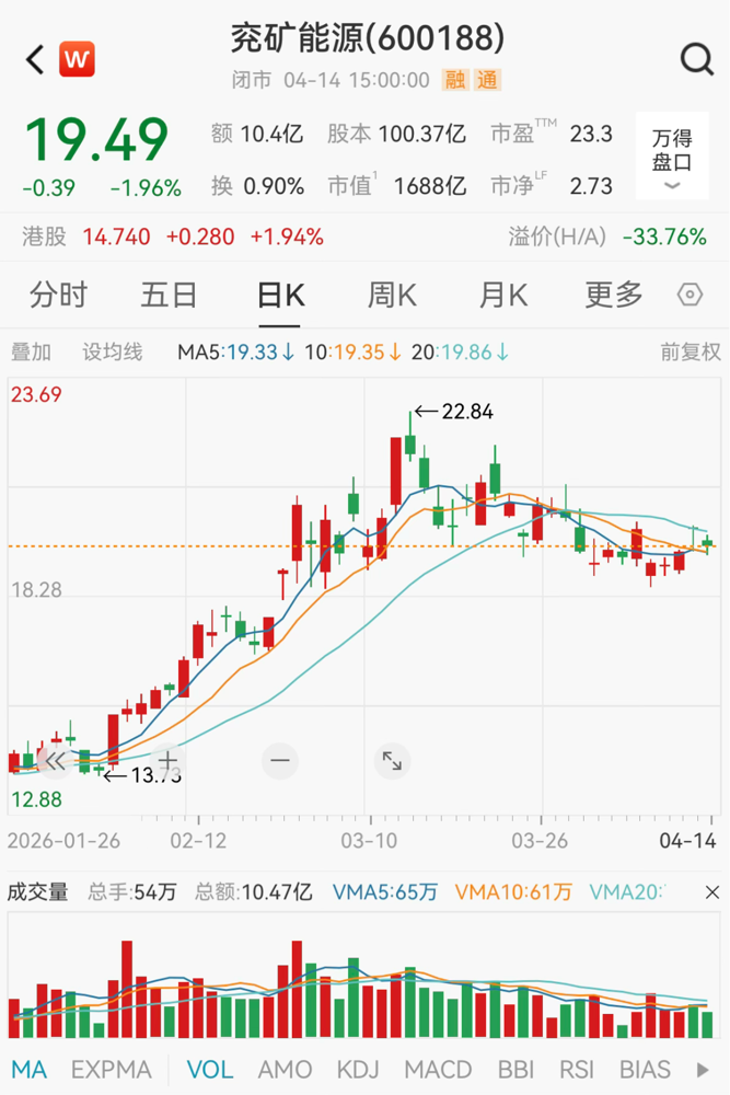 截至4月14日收盘,兖矿能源股价报19.49元/股,最新市值为1688亿元,最新股东户数为9.16万户。