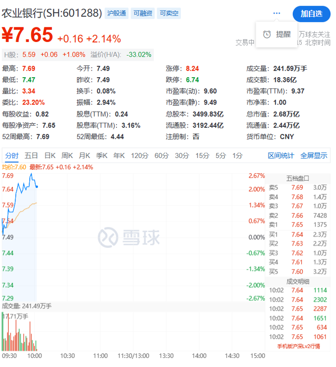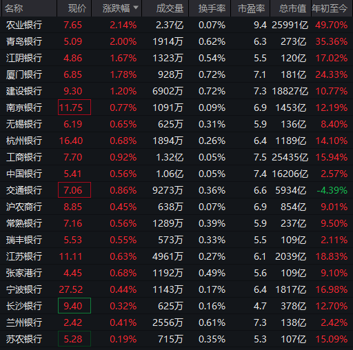 银行股持续攀升,农业银行涨超2%,再创历史新高,总市值突破2.6万亿元,此前录得10连阳。此外,青岛银行、江阴银行、厦门银行等跟涨。