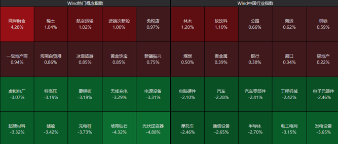从板块来看,福建自贸区概念股涨幅居前,银行股持续攀升,稀土、航运、贵金属等板块表现活跃;而电网设备、半导体芯片、光伏风电、超硬材料等方向跌幅居前。