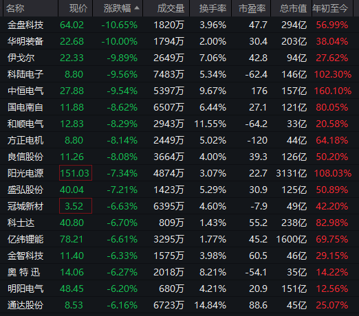 电工电网、发电设备板块跌幅居前,金盘科技跌超10%,华明装备、伊戈尔、科陆电子等跌超9%。