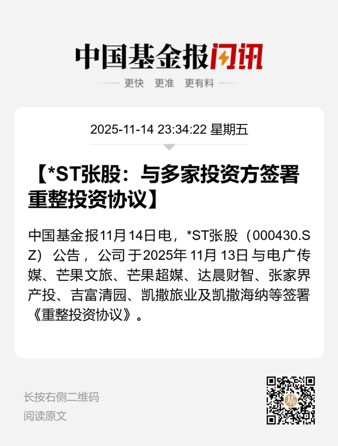 11月14日晚间,*ST张股发布公告称,公司、管理人已与8名重整投资人签订了《重整投资协议》,包含电广传媒、芒果超媒、凯撒旅业等3家A股公司。