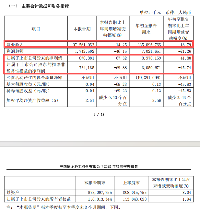 2025年前三季度,中国中冶的营业收入为3350.94亿元,同比下降18.79%;归母净利润为39.70亿元,同比下降41.88%;扣非后净利润为30.51亿元,同比下降45.74%。