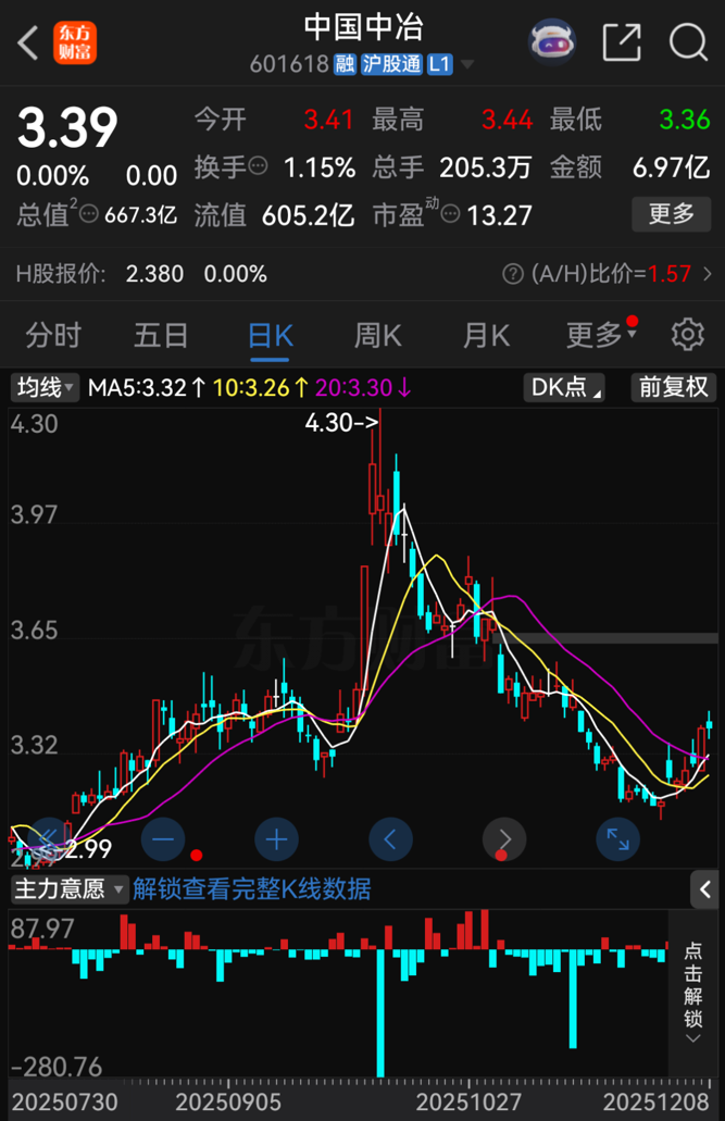 截至12月8日收盘,中国中冶A股股价报3.39元/股,总市值为667.3亿元。