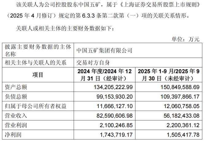 截至2025年第三季度末,中国五矿的资产总额为1.51万亿元,归母所有者权益为1206.08亿元。2024年及2025年前三季度,中国五矿的净利润分别为174.37亿元及150.54亿元。