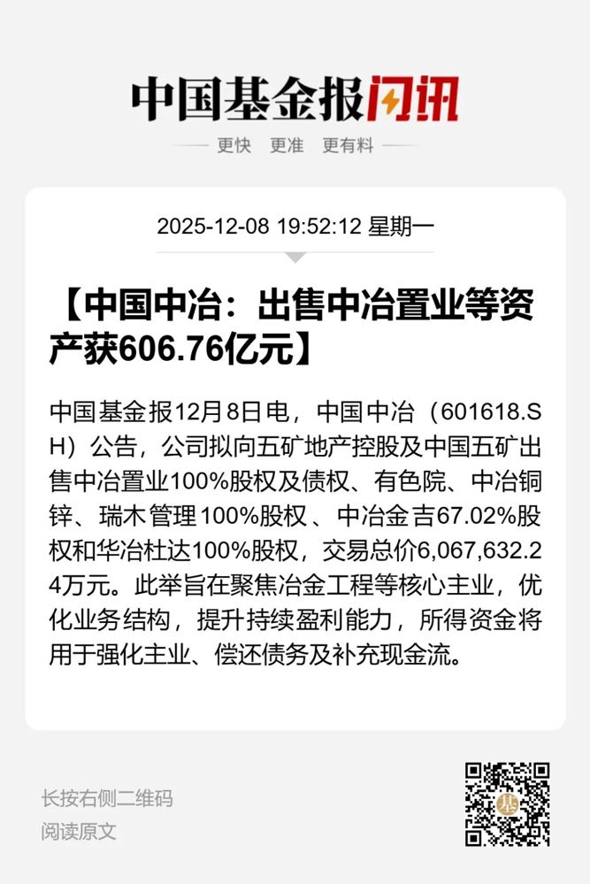 12月8日晚间,中国中冶发布公告称,公司拟以606.76亿元的价格,出售资产给中国五矿集团有限公司(以下简称中国五矿),以及中国五矿的全资子公司五矿地产控股有限公司(以下简称五矿地产控股)。