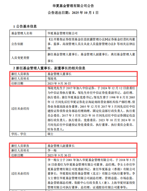 9月30日晚间,华夏基金发布公告称,邹迎光新晋华夏基金董事长,李一梅新晋公司副董事长,任职日期为9月30日。原华夏基金董事长张佑君因工作需要离任。