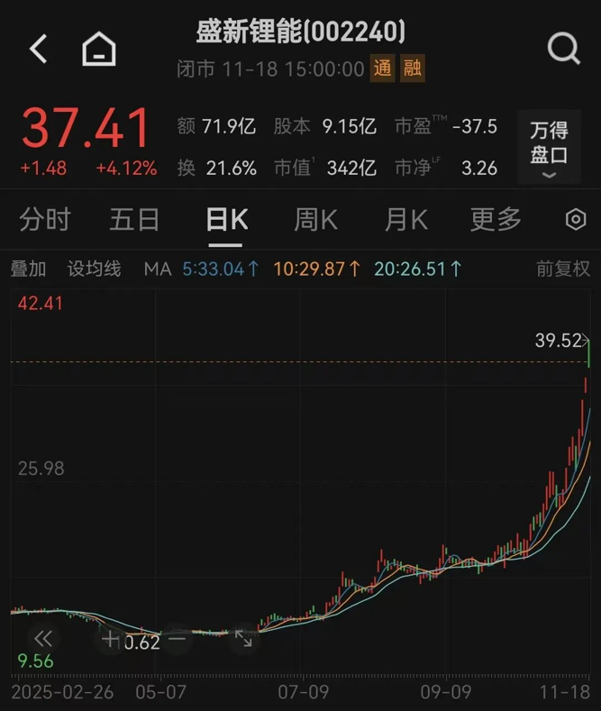11月18日,盛新锂能股价以37.41元/股报收,最新市值为342亿元。相对于2025年4月的历史低点,公司股价已大涨252.26%。同日,华友钴业股价以64.3元/股报收,最新市值为1219亿元。