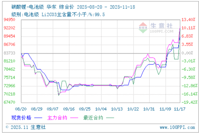 相对于2025年5月底的历史大底,广州期货交易所11月18日收盘的GFEX碳酸锂价格已经大涨59.56%。