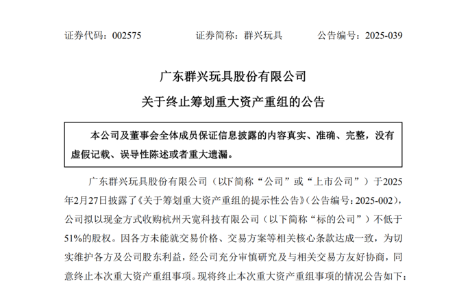 10月20日晚间,群兴玩具(证券代码:002575)突发公告称,因各方未能就交易价格、交易方案等相关核心条款达成一致,决定终止筹划收购杭州天宽科技有限公司(以下简称天宽科技)不低于51%股权的事项。