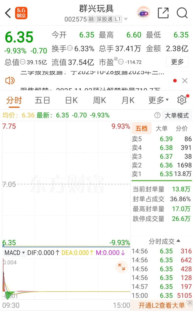 10月21日开盘,群兴玩具以跌停亮相,投资者“用脚投票”,表达对公司战略推进受挫的失望。截至收盘,跌停板封单仍超13万手,公司最新市值为39.15亿元。