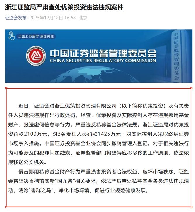 近日,证监会对优策投资及有关责任人员违法违规作出行政处罚。经查,优策投资及实际控制人存在违规挪用基金财产、报送虚假信息等行为,严重违反私募基金法律法规。
