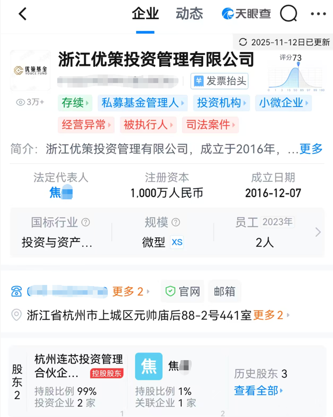 天眼查信息显示,优策投资成立于2016年12月,注册地位于浙江省杭州市上城区,主要从事投资管理业务。优策投资的控股股东为杭州连芯投资管理合伙企业(有限合伙),实际控制人为李晓晴。但根据监管查明,优策投资的实际控制人为黄巍。目前,该公司存在“经营异常”“被执行人”“司法案件”等多个负面标签。