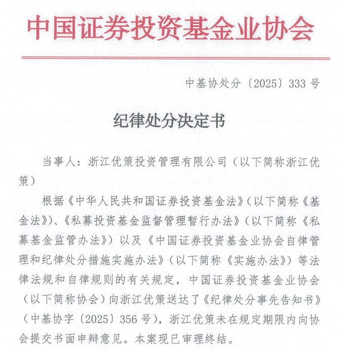 12月12日,基金业协会公布了对优策投资的纪律处分决定书。