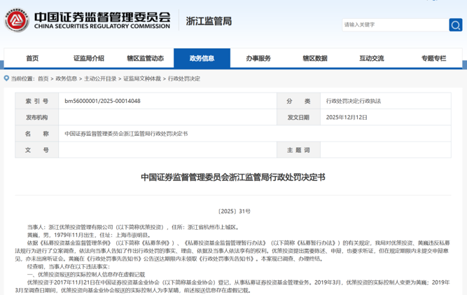 12月12日,证监会官微发布消息显示,证监会对浙江优策投资管理有限公司(以下简称优策投资)及有关责任人员违法违规作出行政处罚。