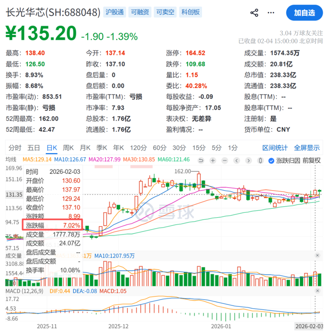 2月4日,长光华芯开盘走低,盘中跌幅一度超过7%。截至收盘,长光华芯报135.2元/股,总市值为238亿元。