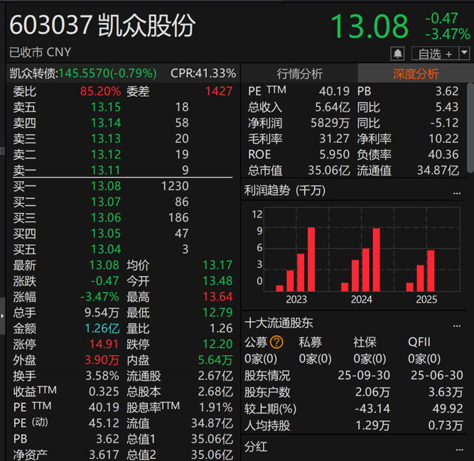 截至11月21日收盘,凯众股份报13.08元/股,总市值为35.06亿元。