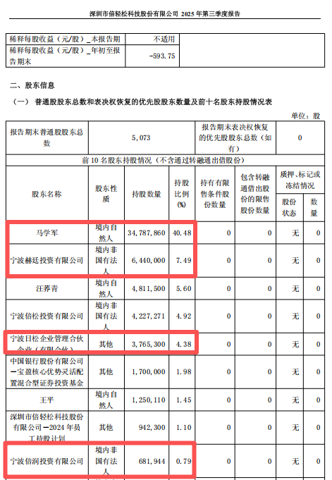 截至2025年第三季度末,马学军直接持有倍轻松40.48%的股份,并通过宁波赫廷投资有限公司、宁波日松企业管理合伙企业(有限合伙)、宁波倍润投资有限公司,合计间接控制倍轻松12.66%的股份。