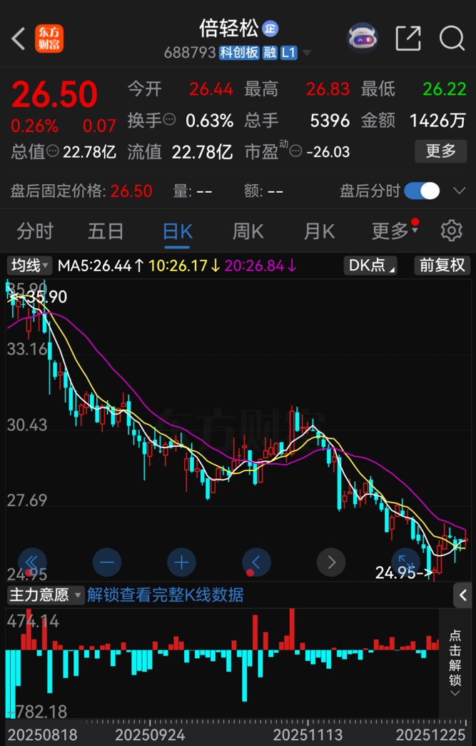 截至12月25日收盘,倍轻松股价报26.50元/股,总市值为22.78亿元。