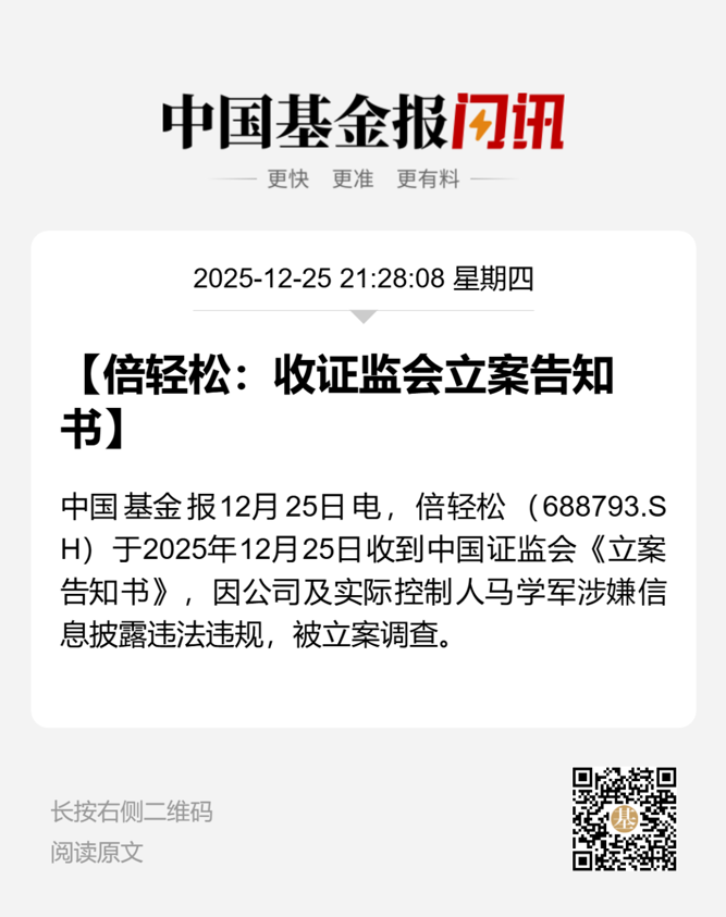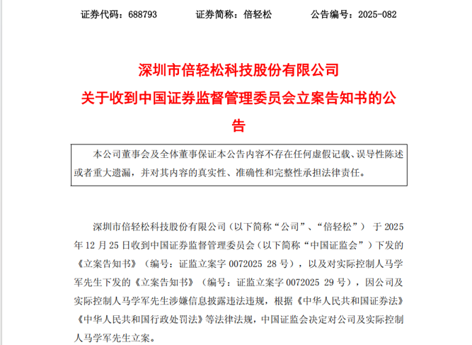 12月25日晚间,倍轻松发布公告称,公司及实控人马学军当日收到中国证监会下发的《立案告知书》。