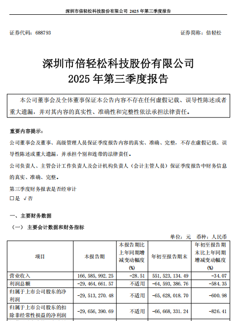2025年前三季度,倍轻松的营业收入同比下降34.07%至5.52亿元,归母净利润同比下降600.98%至-6562.80万元,扣非后净利润同比下降826.41%至-6666.83万元。