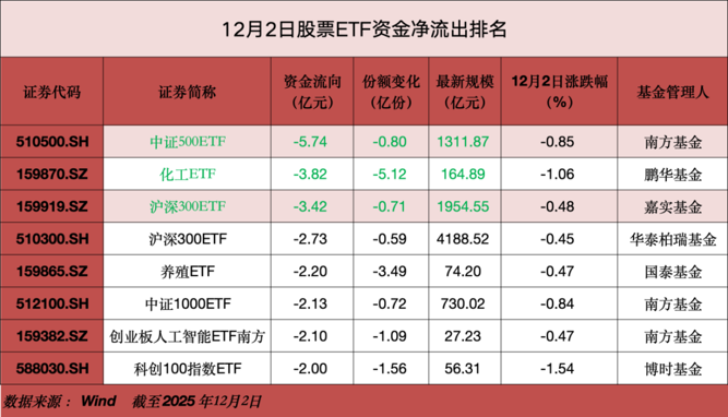 12月2日(本周二),A股三大股指集体下挫,创业板指跌0.69%,深证成指跌0.68%,上证指数跌0.42%。在市场震荡回调之时,股票ETF资金流向相对平稳,单日净流入16.19亿元。