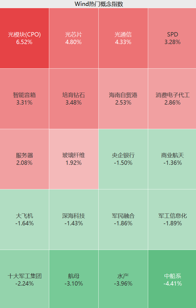 盘面上,上午通信板块大涨,“光的力量”持续火热,光模块、光通信、光芯片等概念股集体活跃,电子、医药生物、建筑材料等板块亦有涨幅;国防军工、银行、传媒等板块回调。