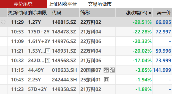 11月26日上午,万科债延续昨日跌势。“21万科04”“22万科02”“22万科04”“22万科06”“21万科02”等多只债券盘中成交价较前收盘价首次下跌达到或超过20%,触及临停。