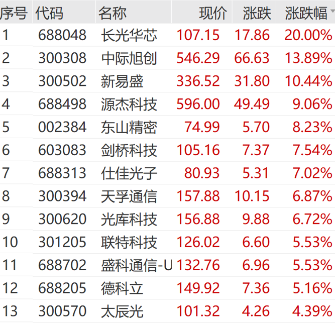 个股方面,长光华芯走出20cm涨停,新易盛、源杰科技、剑桥科技、天孚通信等多股大涨。