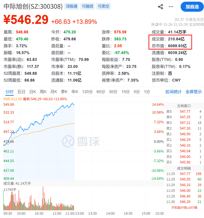 中际旭创盘中最高价达到549.88元/股,再创历史新高,总市值突破6000亿元;半日成交额达210.84亿元,居于A股市场首位。