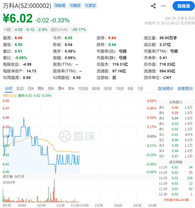 随着债券价格下挫,近期万科股价也有所走低。截至午间收盘,万科A报6.02元/股,跌0.33%;盘中最低价为6元/股,创2015年以来新低。