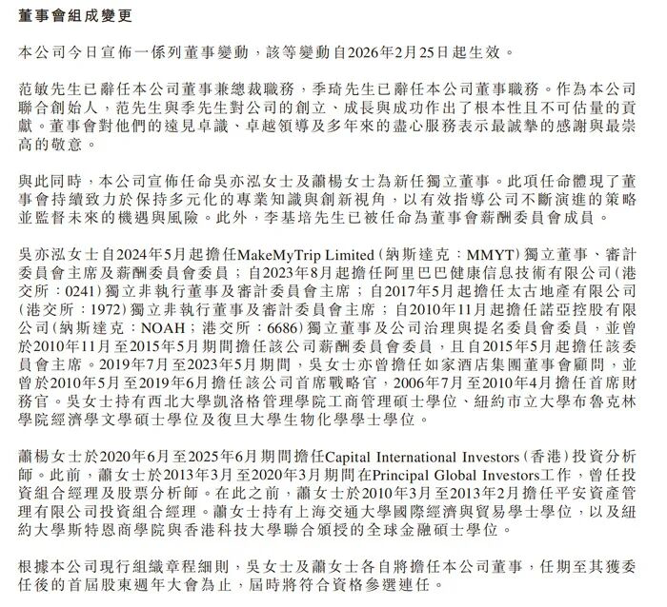 发布财报当日,携程同步公布了一系列董事变动,变动自2026年2月25日起生效。