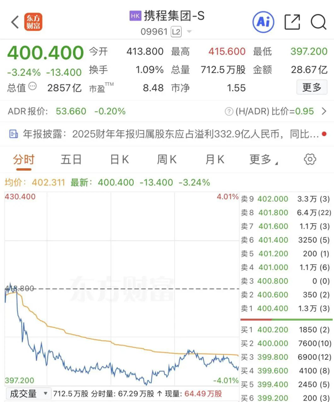 财报发布后,携程港股股价下挫,盘中一度跌超4%。截至收盘,携程跌3.24%,最新市值为2857亿港元。