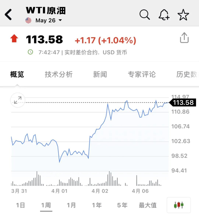 WTI 5月原油期货涨近0.78%,报112.41美元/桶,连续两个交易日刷新2022年6月以来收盘高位。布伦特6月原油期货涨近0.68%,报109.77美元/桶,刷新3月20日以来高位。