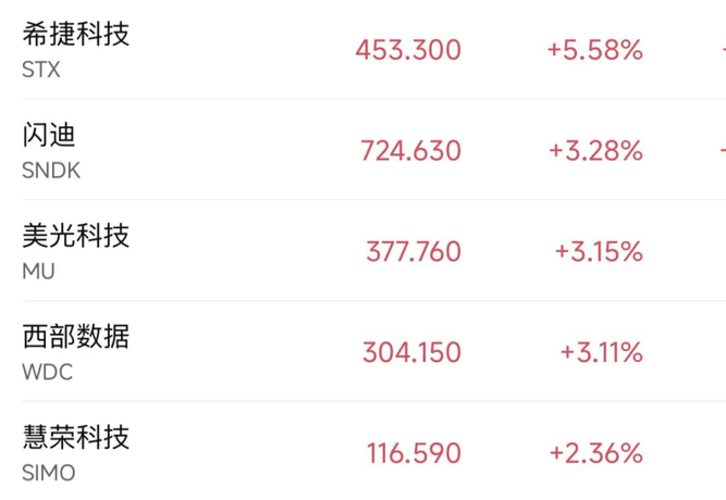 美东时间4月6日,美股存储概念股多数走高。希捷科技涨5.58%,创历史新高。大摩将该股列入其首选股名单。闪迪涨3.28%,美光科技涨3.15%,西部数据涨3.11%,慧荣科技涨2.36%。